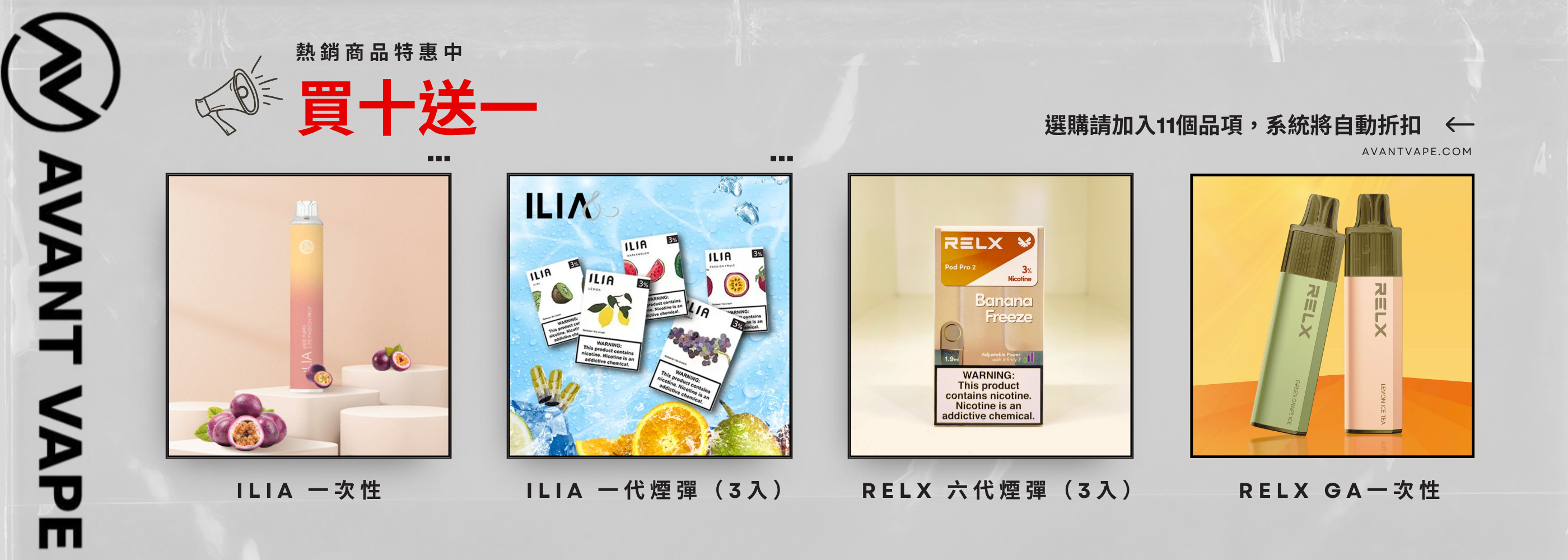 Avant vape 最熱賣的人氣商品在這裡:ilia哩啞煙彈式、Hueb一次性與Relx Pod Prod六代煙彈等應有盡有,若沒有看到想要的電子菸或煙彈煙油,也可以洽詢客服。